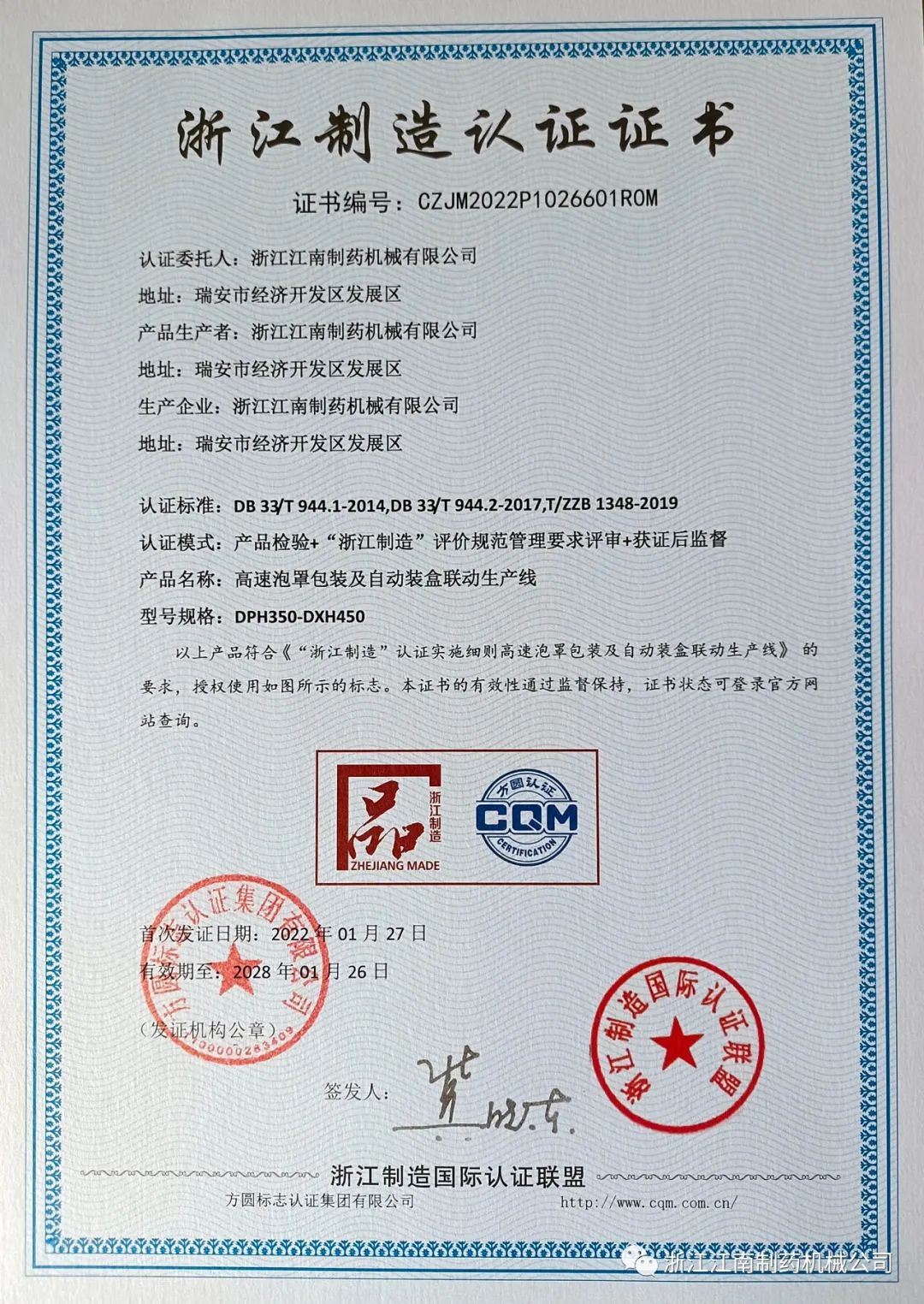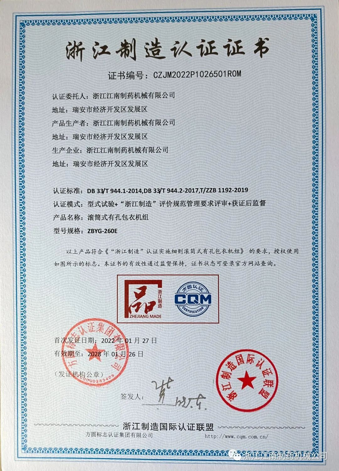 星空官方入口收到了由浙江制造国际认证联盟颁发的“浙江制造”认证证书。