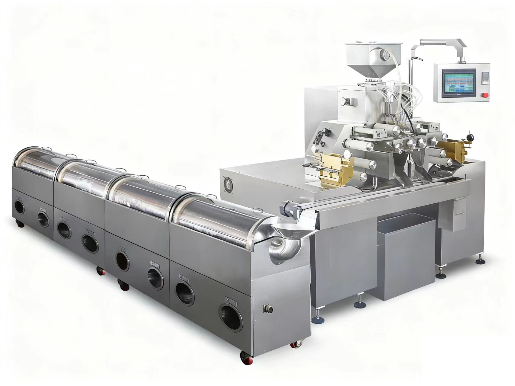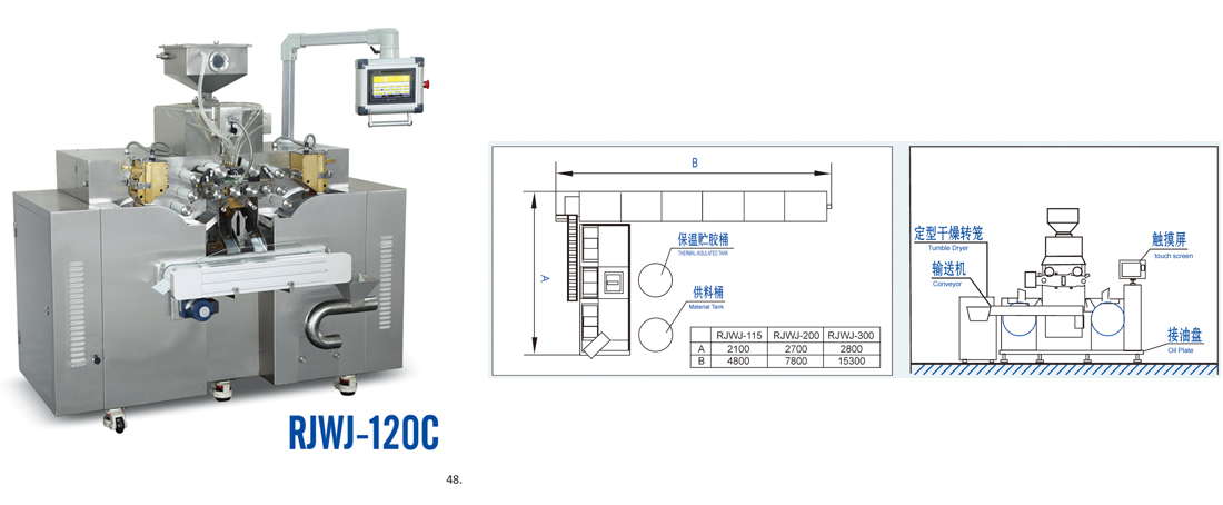软胶丸机可将油类液体、混悬液或糊状物定量注入胶膜中,形成大小、形状、色彩各异的密封软胶丸。由于软胶丸具有崩解速度快、生物利用率高、外形雅致、