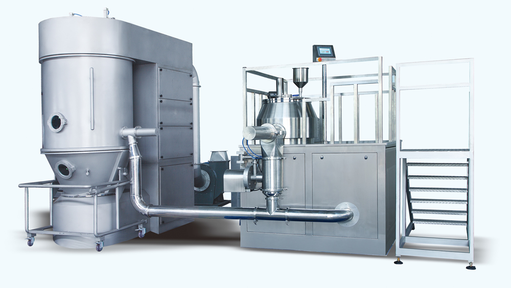 该机组是生产中成药、合成药冲剂、片剂胶囊颗粒的理想设备。该设备严格按照制药工业协会"GMP"规范制造;其全部外壳。出料口、管道以及所有与药品接触的部件全部采用不锈钢材料制造。整个工艺操作过程由PLC可编程序系统控制,有手动操作控制和自动操作控制。控制系统具备多种应用程序,控制参数全部显示在触摸屏上。操作全部是在密闭状态下,是一种优质高效。可靠,洁净、节能、占地面积少、操作方便符合GMP规范的新型制粒干燥机组设备。